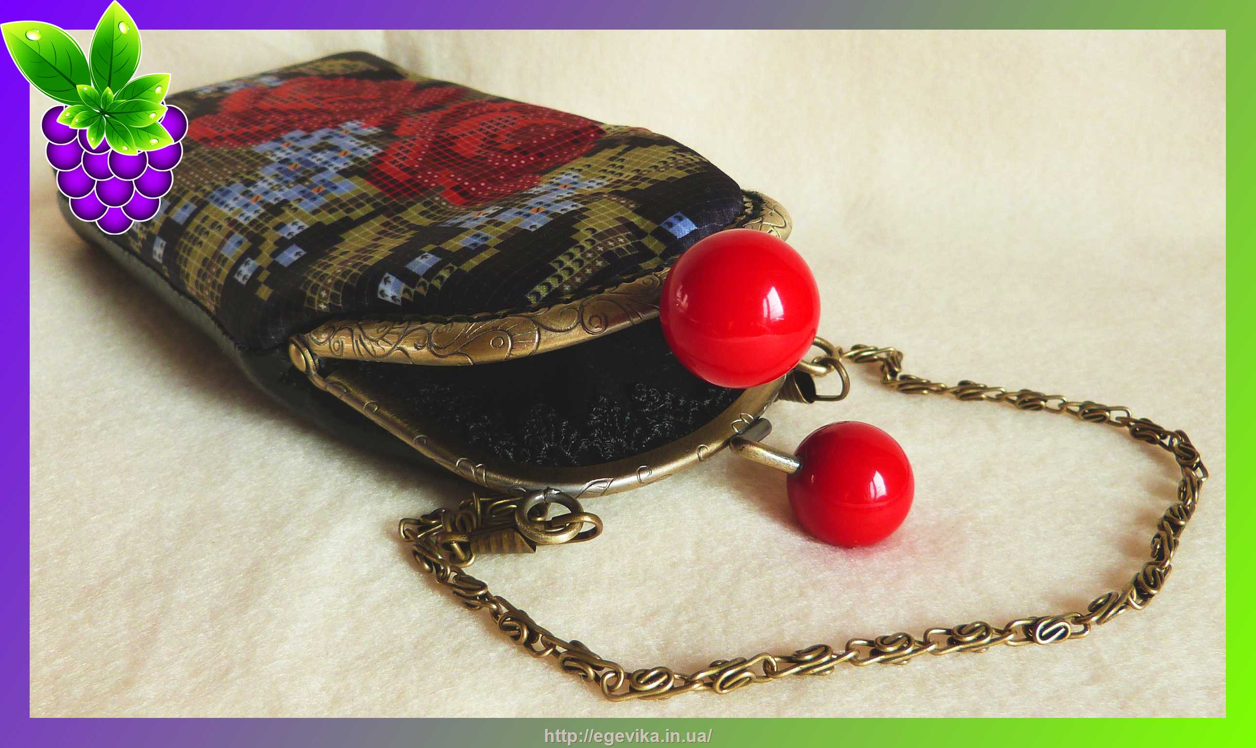 Ткань, схема, материал: Атлас с нанесенным рисунком для полной вышивки бисером. Заменитель кожи (Италия). Фермуар металлический, застежка пластиковые бусины. Шлейка ручка металлическая.