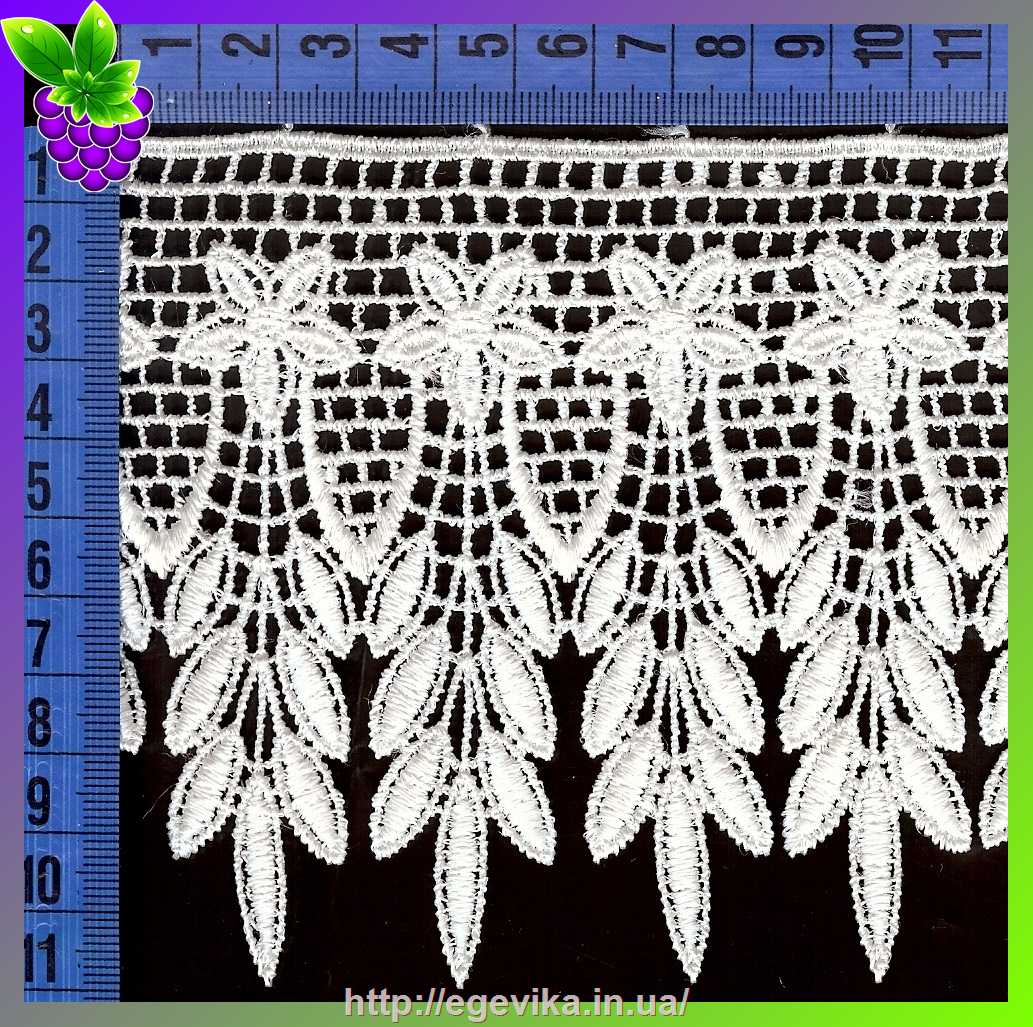 Артикул производителя: 4172Ширина: 10,0 см Вид: макраме плетенное Способ создания: машинный Основа: отсутствует Материал: полиэстр Цвет: белый Фестоны: с одной стороны Эластичность: не тянется Цена указана за 1 погонный метр