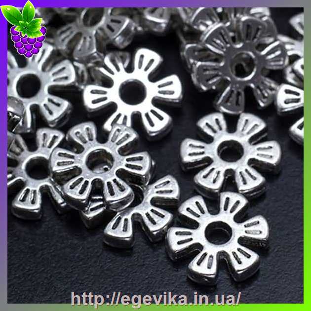 Артикул производителя: 19175Бусина разделитель Материал: метал Цвет: античное серебро, черненное Форма: цветок плоский Размер: диаметр - 8 мм, толщина - 2 мм, отверстие - 2 мм