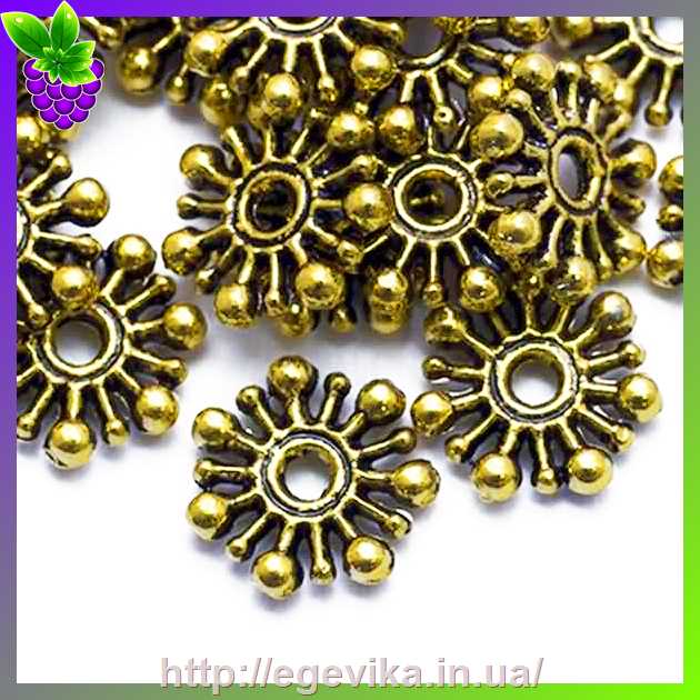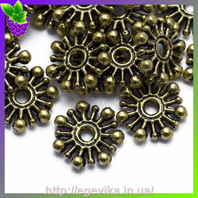 Артикул производителя: 19042Бусина разделитель Материал: метал Цвет: античное золото, черненное Форма: цветок/снежинка плоская Размер: диаметр - 9,5 мм, толщина - 2 мм, отверстие - 2 мм