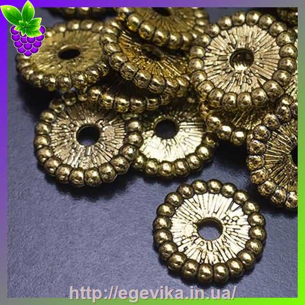 Артикул производителя: 19170Бусина разделитель Материал: метал Цвет: античное золото, черненное Форма: круглая, диск Размер: диаметр - 11 мм, толщина - 1,5 мм, отверстие - 2 мм