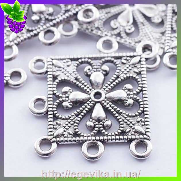Артикул производителя: 28238Коннектор, 1 кольцо-основа и 5 отверстий Материал: металл Цвет: античное серебро Размер: 36,5х34х1,5 мм, диаметр отверстия - 2 мм Форма: ромб