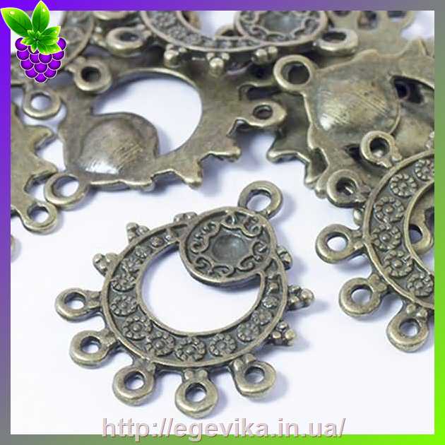 Артикул производителя: 536Коннектор, 1 кольцо-основа и 5 отверстий Материал: металл Цвет: бронза Размер: 27х23х1,5 мм, диаметр отверстия - 1,5 мм Форма: капля
