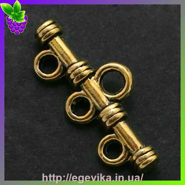 Артикул производителя: 6581Коннектор, 1 кольцо-основа и 3 отверстий Материал: металл Цвет: античное золото Размер: 20х9х3 мм, диаметр отверстия - 1,5 мм Форма: прямоугольная