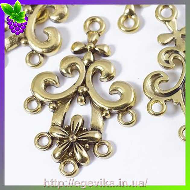 Артикул производителя: 28270Коннектор, 1 кольцо-основа и 5 отверстий Материал: металл Цвет: античное золото Размер: 31х21х2 мм, диаметр отверстия - 1,5 мм Форма: цветок, вензеля