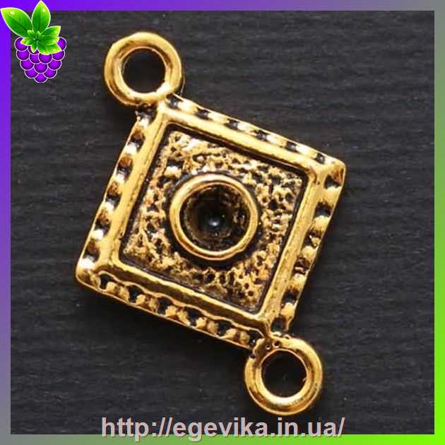 Артикул производителя: 6485Коннектор, 2 отверстия Материал: металл Цвет: античное золото Размер: 21х15х2 мм, диаметр отверстия - 2 мм Форма: ромб Пригоден под стразы