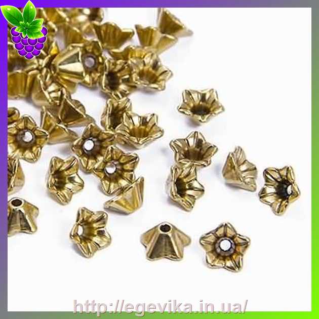 Артикул производителя: 30380Концевик конус, шапочка для бусин Материал: металл Цвет: античное золото Форма: круглая, цветочек Размер: 8,5 х 5 мм, отверстие - 1 мм