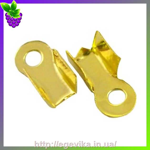 Артикул производителя: 5039Концевик-зажим для лент. Материал: металл Цвет: золото Размер: 9х3,5х4 мм, отверстие - 2 мм