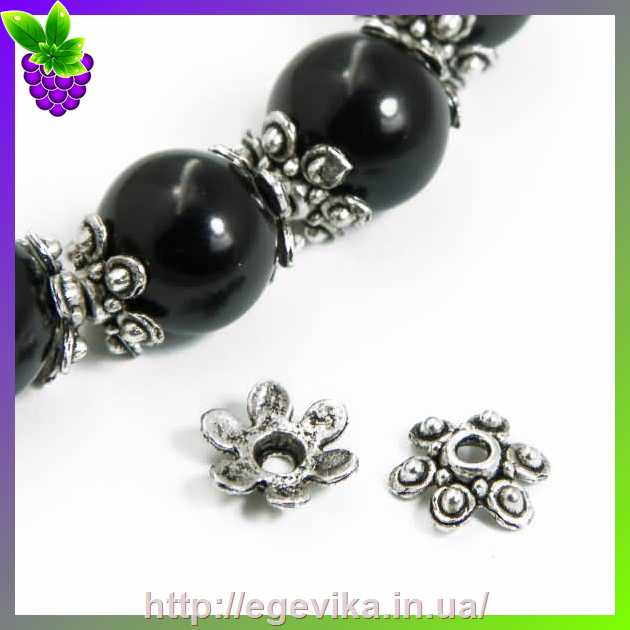 Артикул производителя: 1820Обниматель цветочек. Материал: металл Цвет: античное серебро Форма: круглая, цветок 6 лепестков Размер: 10 х 3 мм, отверстие - 1 мм