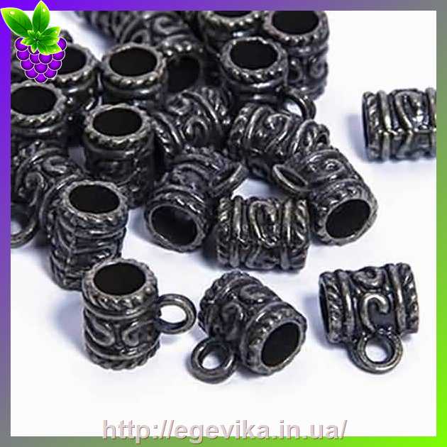 Артикул производителя: 30301Бейл, власник кулона, коннектор у тибетському стилі. У бейла 1 кільце для з'єднання з іншими елементами, а також більша петля для просмикування шнура або ланцюжка. Матеріал: метал Колір: бронза Форма: барило, трубка. Розмір: 11 х 7,5 мм, отвір - 2 мм і 4 мм