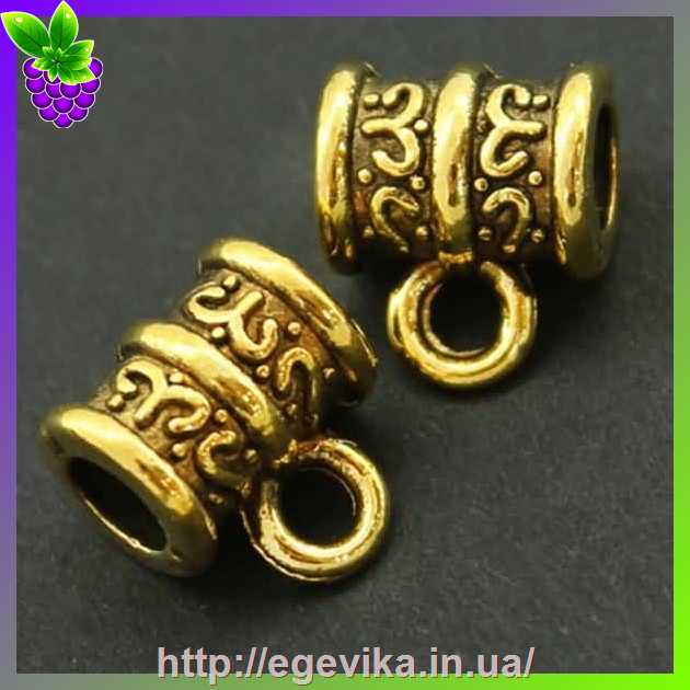 Артикул производителя: 7873Бейл, власник кулона, коннектор у тибетському стилі. У бейла 1 кільце для з'єднання з іншими елементами, а також більша петля для просмикування шнура або ланцюжка. Матеріал: метал Колір: золото Форма: барило, трубка. Розмір: 10 х 9 х 6 мм, отвір - 2 мм і 4 мм