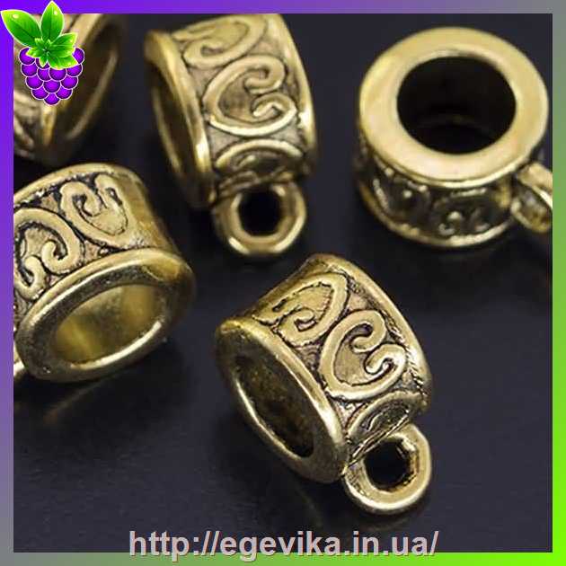 Артикул производителя: 3922Бейл, власник кулона, коннектор у тибетському стилі. У бейла 1 кільце для з'єднання з іншими елементами, а також більша петля для просмикування шнура або ланцюжка. Матеріал: метал Колір: античне золото Форма: трубка, барило. Розмір: 8,5 х 6 мм, отвір - 2 мм і 5 мм