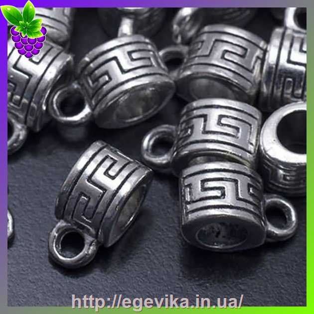 Артикул производителя: 19072Бейл, власник кулона, коннектор у тибетському стилі. У бейла 1 кільце для з'єднання з іншими елементами, а також більша петля для просмикування шнура або ланцюжка. Матеріал: метал Колір: античне срібло Форма: трубка, барило. Розмір: 10 х 5 х 5,5 мм, отвір - 2 мм і 4 мм