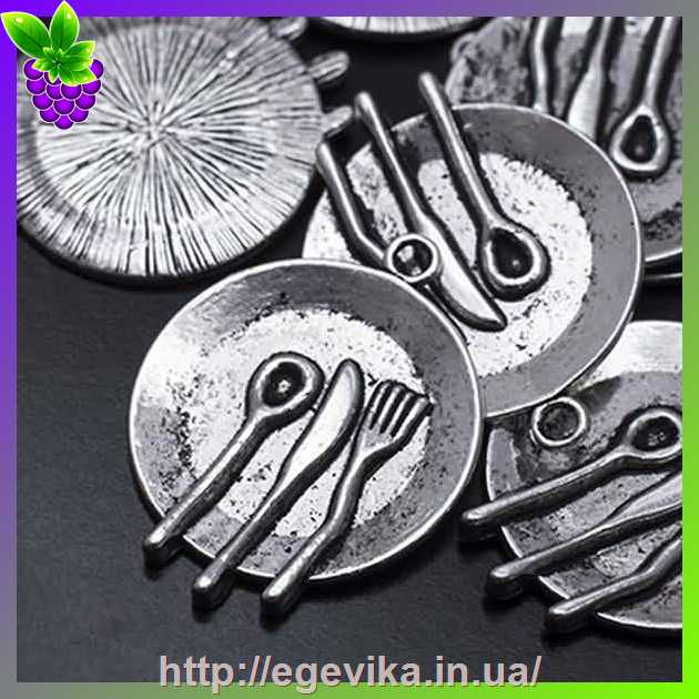 Артикул производителя: 19124Кулон-Підвіска тарілка. Матеріал: метал Колір: античне срібло Форма: тарілка зі столовими приладами Розмір: 30 х 23 х 2 мм, отвору - 3 мм