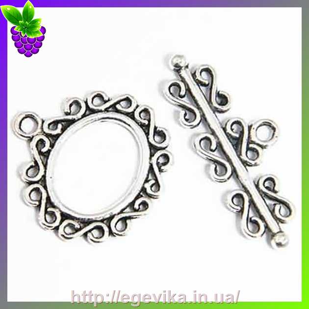 Артикул производителя: 31681Застібка тогл складається з 2- х частин. Матеріал: метал Колір: античне срібло Форма: овальна, завитушки- знаки нескінченності Розмір: 23 x 1,5 мм, паличка - 32 х 12 мм, отвір - 2,5 мм