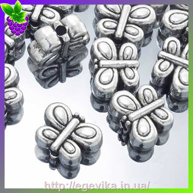 Артикул производителя: 2303Бусина металева Матеріал: метал Колір: античне срібло Форма: метелик Розмір: 10,5 х 8 х 4,5 мм, отвір - 1 мм