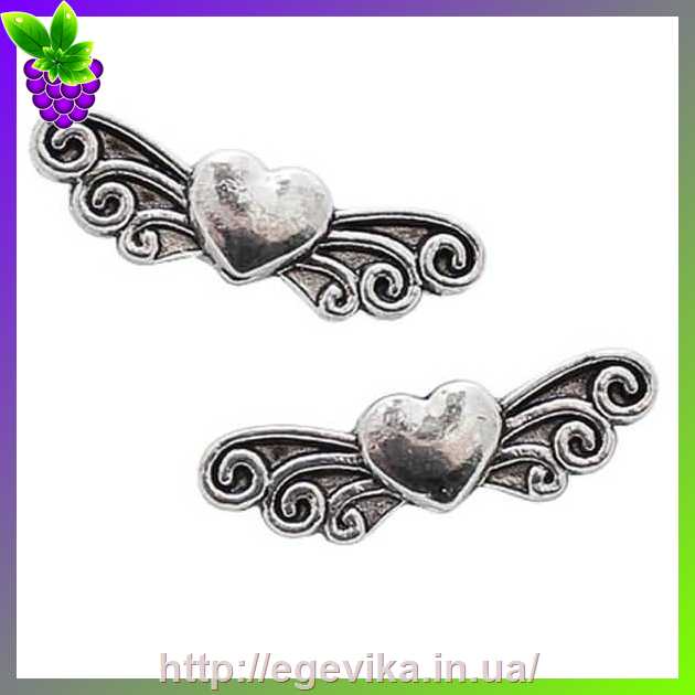 Артикул производителя: 5741Бусина металева Матеріал: метал Колір: античне срібло Форма: серце із крильми Розмір: 24 х 17 х 6 мм, отвір - 1 мм