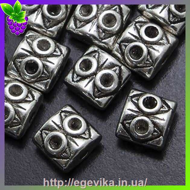 Артикул производителя: 2583Бусина металева Матеріал: метал Колір: античне срібло Форма: плоска, квадрат Розмір: 7 х 6,5 х 5 мм, отвір - 1,5 мм