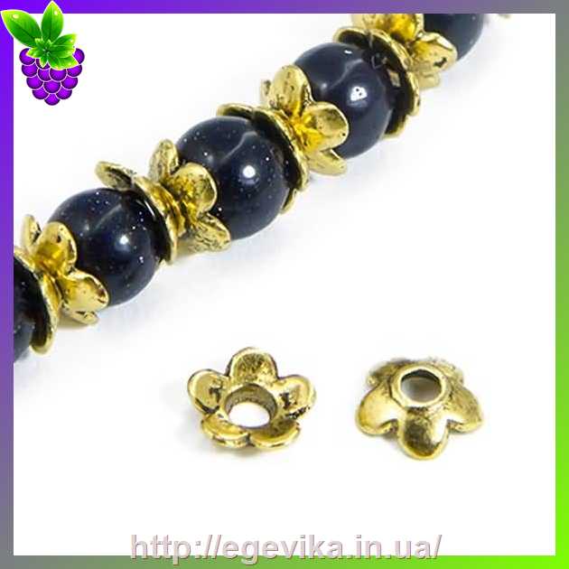 Артикул производителя: 1625Обниматель, шапочка для бусин Матеріал: метал Колір: античне золото Форма: кругла, квіточка Розмір: 6,5 х 2 мм, отвір - 2 мм Кількість: 4 шт