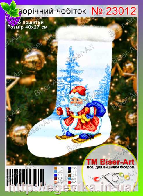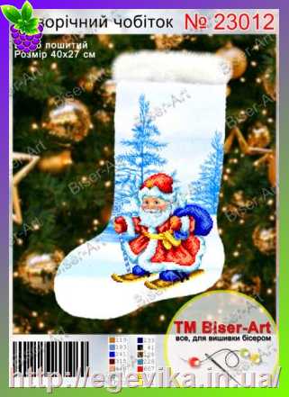 Пошита заготовка для подальшої вишивки бісером новорічного чобітка для подарунків.Новорічний чобіток для подарунків прикрашає інтер'єр приміщення. Розмір: 27 х 40 смКількість квітів: 14Тканина, схема: габардин з нанесеним малюнком для часткової вишивки бісером. Зображення під вишивку ущільнене флизелином. Чобіток для подарунків зшитий, зворотна частина - габардин, верх - штучний мех. Є петелька для підвішування.Техніка: Вишивка бісером, шов напівхрест ("монастирський" шов)У комплект входить: пошита заготовка з нанесеним малюнком із вказівкою номерів ниток DMC і необхідною кількістю бісеру Precіosa (Чехія).Рекомендації: Заготовка вже пошита, потрібно тільки вишити її бісером і/або нитками. Бісер у комплект не входить.Ви можете замовити бісер у нас на сайті.Ми виконуємо добір бісеру до схем для вишивання.