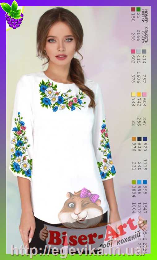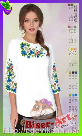 Вышиванка сорочка жіноча. Модель із круглою горловиною й довгими рукавами.Тканина, схема: Габардин з нанесеним малюнком для вишивки бісеромКількість квітів: 16Техніка: Вишивка бісеромУ набір входить: чотири відрізки тканини з надрукованою схемою вишивки (перед, спинка й два рукава), перелік квітів і кількість бісеру.Розміри тканини: перед - 80х75 (70) см, спинка - 80х75 (70) см, рукав - 60х75 (70) см.Рекомендації: Перед вишиванням зони під вишивку потрібно проклеїти флизелином, що б тканина не розтягувалася під вагою бісеру. Після закінчення вишивання зайвий флизелин відривають по краю вишивки, що б він не виступав. Потім по бажаній вишивці розкроюють тканину й зшивають деталі.