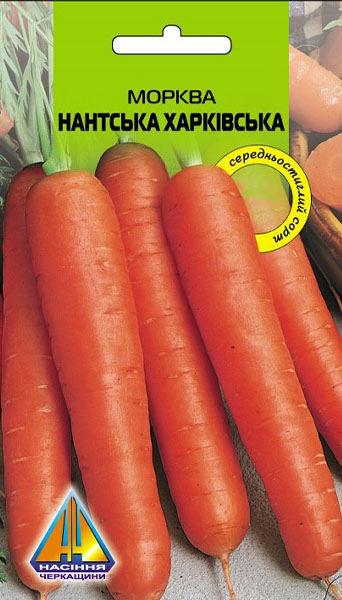 Морква Нантська Харківська (10г), середньостигла, коренеплід 10-18см, діаметром 3,5-4,5см, масою 142-150г